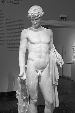 [[File:Omphalos Apollo, marble, Roman copy, 130 AD, Antikensammlung Berlin, 141763bw.jpg|thumb|left|256px|[[commons: File:Omphalos Apollo, marble, Roman copy, 130 AD, Antikensammlung Berlin, 141763bw.jpg|Apollón z omfalu. Torzo mramorové římské kopie, která v něm vidí podobu Antinoa. Řecký originál byl z doby kolem roku 460 před n. l. Altes Museum Berlin.]] ]]
