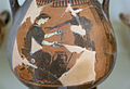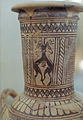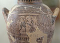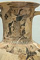 Jeden kousek pozdně archaické keramiky svou malbou, byť ještě stále černofigurovou, trochu předjímá následující klasickou dobu. Je to import z Athén. Athénský vázový malíř Eucharidés (pokud ovšem jde o jméno individuálního tvůrce a ne jméno spíše jen typologické) zobrazil v letech 520 až 500 před n. l. na attické peliké všednodenní scénu: prodej oleje. Častější kupodivu bývá opačná kombinace, totiž athénská červenofigurová keramika už koncem archaické doby, ale svými ostatními rysy blízká archaické.