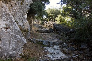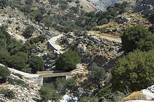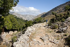 Od horní autobusové zastávky v Apeiranthu vede ke kostelu dobře značená, příjemně schůdná a orientačně bezproblémová cesta, zčásti po staré kalderími (soumaří dálnice). Cedule udává čas 1 hodina 10 minut, ale to je míněné pro drsné horaly. Cesta napřed klesá zahradami Apeiranthu, mine odbočku k tuctovějšímu byzantskému kostelu Ag. Theologos, až se otevře horský výhled. Vypadá to, že scházíme dolů z hor. Naklesáme skoro 300 metrů, pak za nově postaveným můstkem zase stoupáme, už k Ag. Kyriaki. Cesta pokračuje k bývalým smirkovým dolům. V okolí bývalo husté byzantské osídlení, ale kromě kostela z něj zbyly jen trosky zídek.