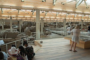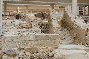 Po rekonstrukci působí místo líp, je to patrné už od vchodu dovnitř. Jsou zde trosky staveb z první fáze pozdní doby bronzové, zničené sopečnou erupcí roku asi 1628 před n. l. Byly tu ulice, náměstí s několikapatrovými domy, četná schodiště, jak je na Kykladách zvykem v každé době. K tomu dvojí rozvod vody, nejspíše studené a teplé, asi geotermální, splachovací záchody. Řada místností byla zdobená jemně provedenými freskami, ty jsou dnes v muzeích, hlavně ve Fiře a v Athénách. Přes dominanci mínójské kultury se prý nejedná o „palácové město“ v krétském smyslu slova, je to urbanisticky jinak koncipované. Možná proto, že navazuje na předmínójský půdorys? Nebo jenom proto, že to prostě bylo svérázné město, snad něco jako Singapur v malém a mnohem dřív? Náměstí, ulice a skupiny domů jsou často pojmenované podle hlavních nálezů.