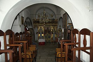 Klášterní kostel pochází z 12. století, alespoň většina jeho zdí. Stojí ovšem na něčem mnohem starším, možná ho v průběhu středověku záměrně rozšířili tak, aby pojal i malou antickou věštírnu. Různé přístavky a samozřejmě nábytek jsou naopak novější. Pravá loď kostela je zvláštním způsobem rozčleněná a navazují na ni různé výklenky. Hned blízko vchodu je pramen, který prý však není věštebný, možná tudy vedl odtok toho věštebného, jak to leckde bývalo, kdo ví. Dál od vchodu je prostor věštírny, jejíž pramen je teď zabetonovaný, navíc s dost absurdně působícím křížem v betonu. Vpravo nad bývalým pramenem je jakási nika nejasného účelu, ve které leží skrovné votivní dary, bižuterie. Zbytky fresky uvnitř niky vypadají starší než na zdi nad ní.