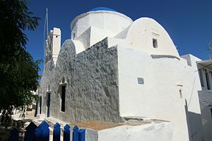 Zvláštní je, kolik kostelů tu postavili i za Turků. V Apollónii je taky folklorní muzeum s keramikou a oděvy, prý včetně nějaké antické keramiky – a vede odtud řada značených cest po ostrově. Vandrácky ladění turisté se tu potkávají s lepšími lidmi, neboť ti dávají zvláště večer Apollónii přednost. (Přestupy mezi autobusy jsou ovšem řešeny poněkud obskurním způsobem, nikoli na jednom místě.) Apollónia tvoří téměř souvislou aglomeraci s Ano Petali a s Artemonas, kde je pro změnu církevní muzeum.
