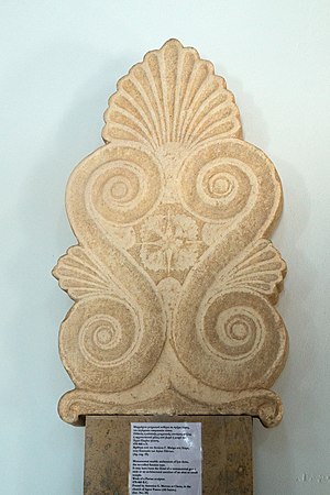 Mramorové anthémion z pohřební stély Práce sochaře z Paru, 470-460 před n. l. Byla zapuštěna do zdi kostela Ag. Eirini u osady Stroubos nedaleko Lagady. Archeologická kolekce na Amorgu, inv. č. A 85 / Ai 1.