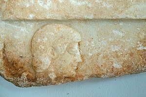 Hlava se zkroucenými pletenci vlasů může zobrazovat zbožštěnou ptolemaiovskou královnu. styl účesu asociuje bohyni Ísis. Nález z Arkesini, mramor, 3. nebo 2. století před n. l.