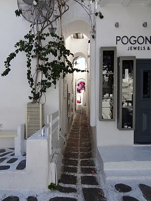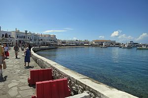 Bizarní hlavní město tohoto obzvláštního kykladského ostrova je kromobyčejně malebné. Původně to bylo rybářské městečko s tradičními domy. Je pečlivě opravené, místy rekonstruované, místy doplněné věrohodně působícími atrapami. Dá se tu prolézat bludištěm uzounkých uliček, v letní večery jsou ovšem beznadějně natlakované lidmi všech kontinentů. Od větrných mlýnů na pahorcích nad městem je nádherný výhled (foto).