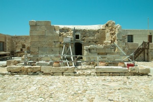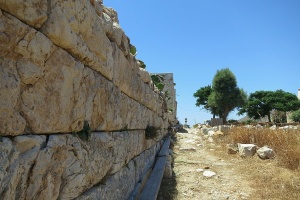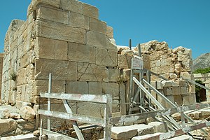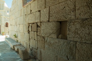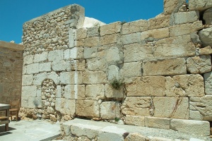 Zvláště kolem západního rohu areálu (z hlediska příchodu od silnice vpravo) dosahuje zeď ze 4. století před n. l. výšky přes 3 metry. Když tento roh obejdeme chodníčkem mezi obvodovou zdí a vnější zahrádkou kláštera, stojíme konečně u hlavního vchodu. Ten je tvořen skutečně impozantní srostlicí dob a stylů – a téměř tunelem nás uvede na nádvoří. Velké kvádry pravé stěny vstupního tunelu, které zaujmou velikostí i medovou barvou mramoru, jsou částí chrámové budovy, kterou pak ze strany nádvoří uvidíme. Její stavební plán je trochu neobvyklý, asi jde o prostylos, otevřený pouze na přední straně. Z oné otevřené „verandy“ se sloupy zbyly na nádvoří jenom základy. Zadní část chrámové budovy prodělala už dříve nějakou křesťanskou přestavbu, dobře viditelnou z rohu nádvoří. Další části chrámových staveb prý byly přestavěné na refektář, snad i s částí stropu.