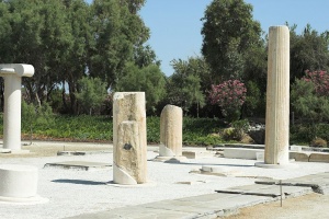 V nové době totiž přicházíme z opačné strany, než přicházeli antičtí poutníci. Přicházíme od míst, kde posvátný okrsek končil, zatímco původní přístupová cesta k němu vedla od moře a ústila tam, kde novodobá úprava místa směrem k moři končí. Tam byly propylaje a blízko nich také hospoda, nebo spíš dům pro symposia, tedy pro „společné pití“.