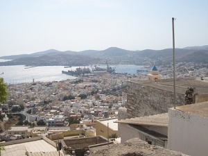 Průmyslový charakter okolí přístavu nás překvapí už když připlouváme k Ermoupoli, hlavnímu městu ostrova. Ermoupolis (Hermovo město) je největším městem na Kykladách a centrem kykladského těžkého průmyslu. V 19. století byl zdejší přístav největší v Řecku a ještě v současné době tu jsou největší doky na Kykladách, velké neorion, tedy loděnice, spíše opravna lodí, a to velkých lodí. Je tu i dost turistů, ale netvoří většinu.