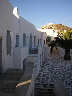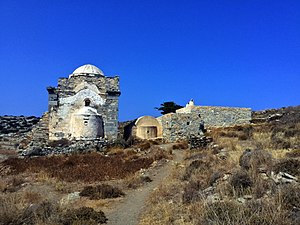 Centrem ostrova je jako obvykle Chóra, ale ta zde prý sestává ze dvou částí: západní Kastro a východní Chorio („Chóřička“). Nahoře na kopci stojí klášter Zoodochou Pigi (Životodárného pramene).