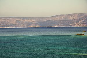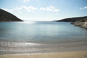 Z cesty zpátky od návrší s areálem je vidět záliv s řadou palem a několika domečky, tedy s projevy prvních pokusů o vzmach výletnictví. Zajímavější je však záliv sám, protože to je dokonalý přírodní přístav, alespoň pro dostatečně malé lodě. I jeho novodobý název říká, že je to záliv téměř uzavřený. Tady byly i malé starokykladské lodě v naprosté pohodě.