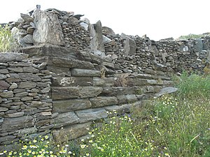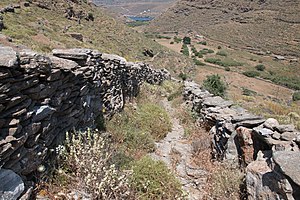 Vzdušnou čarou je to od přístavu jenom 2 km na sever a ani výška 145 m nebudí respekt, jenom se tam mít jak dostat. Vzhledem k členitosti terénu a vedení cest je dobré popojet taxíkem kus směrem k Chóře, aby člověk nechodil po klikaté hlavní silnici. Pak už by to po cestě značené číslem 6 neměl být problém. Neměl by být, ale je, protože kus dál od odbočky je cesta notně zarostlá a nakonec úplně mizí. Hřeben sám je dobře schůdný, ale pod ním jsou kamenité srázy s velkými balvany trnitými křovisky, je to špatně prostupné, zvlášť pokud by člověk chtěl sejít směrem k pláži Apokrousi, což by podle mapy mělo být dobře možné. Spíš je rozumné se vrátit a k Apokrousi jít pak jinou cestou o kousek níž, byť ani ta není bez problémů. Takže se radši omezím na referát o výkopech.