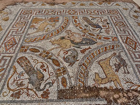 Mozaika s mytologickou scénou a zvířaty z pozdně antického domu v Aplomatě na Naxu (nedaleko Naxijské Chóry) byla přenesena do lapidária Archeologického muzeua v Naxijské Chóře.