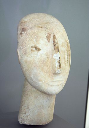 Hlava velké ženské figury, na které se uchovaly zbytky polychromie, se nyní vystavuje v Národním archeologickém muzeu Athénách. Její obličej je specificky stylizovaný: plasticky vyznačené rty, náznak uší. Přes tyto odlišnosti ji s ostatními spojuje vysoko začínající štíhlý a dlouhý nos – a především ploše stylizovaná dozadu ubíhající hlava na dlouhém krku. Možná také měla nějakou ozdobu na své pravé tváři dole, což koresponduje s řeckými archaickými malbami (a sochou) dívky s náušnicí ukotvenou v tváři - přes propast dvou tisíc let! Polychromie určitě zvýrazňovala oči, v ostatním je obtížné ji odlišit od možných poškození. Nicméně se zdá, že na své levé tváři měla už původně čtyři šrámy. Analogií je mezi kykladskými idoly víc, mimo tento kulturní okruh je známe z mariánských ikon, dokonce i západně od Řecka, např. Černá Madona v Čenstochové.