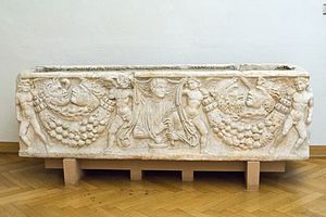 Římský sarkofág se symbolikou ročních dob a podobiznou zemřelého. Kolem 250 n. l. Mramor. NG Praha. (Zapůjčil Dr. Zdeněk Macek.)