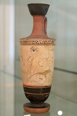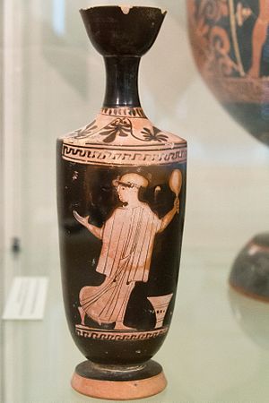 Červenofigurový lekythos. Žena držící zrcadlo. Athény, 470 až 460 před n. l. NG Praha, zapůjčeno Národním Muzeem v Praze, H10 774.