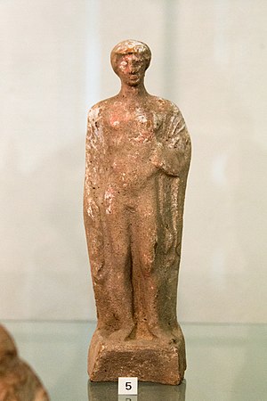 Chlapec (pais) s kohoutem. Nebo spíše eféb? Boiótie, 4. století před n. l., terakota. NG Praha, P 586.