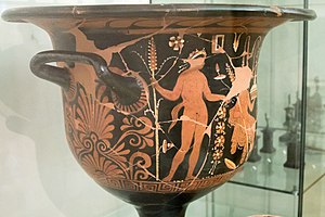 Červenofigurový zvoncový kratér. A: Svatební scéna. B: Tři mladíci v pláštích. Apulie, po roce 330 před n. l. NG Praha, zapůjčeno Národním Muzeem v Praze, HM10 1769.