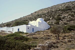 Klášterní kostel Ag. Theodoti stojí poměrně blízko moře. Je postavený na rozvalinách antické budovy, pravděpodobně chrámu. U kostela se našla kamenná deska z 3. století n. l. s reliéfem a nápisem, který popisuje okolnosti jakési oběti, a přitom říká, že proběhla „v měsíci Homérově“. Takové kalendářní určení není jinde neobvyklé.