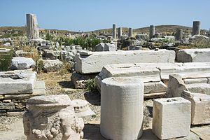 Agora Délských, PrytaneionKousek dál do vnitrozemí je oblast správních budov, prostor Agory Délských, tedy starého místního náměstí – a zbytky prytaneia z klasické doby, tedy obecního úřadu, kdysi opatřeného krbem s věčným ohněm. |