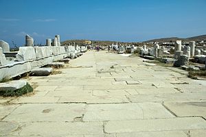 Agora KompetalistůVe 2. století před n. l. byla naopak přímo u mola posvátného přístavu postavená obchodní Agora Kompetalistů, tedy náměstí pojmenované po jakési obchodní společnosti, a posvátná cesta pak začínala teprve vlevo za ním. Na tomto náměstí zůstaly i dva oltáře zasvěcené Hermovi, tedy bohu, jehož nižší dimenze jsou spjaté s obchodem, financemi, podvody a zlodějnou. |