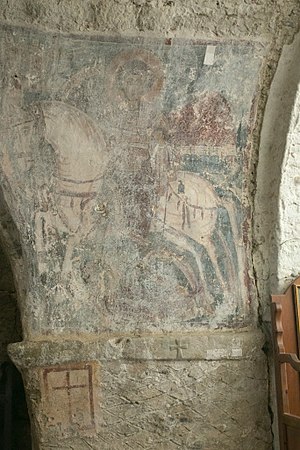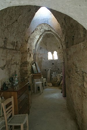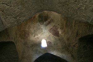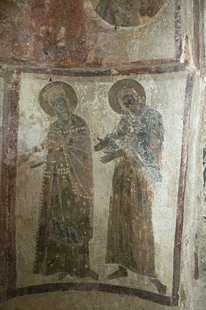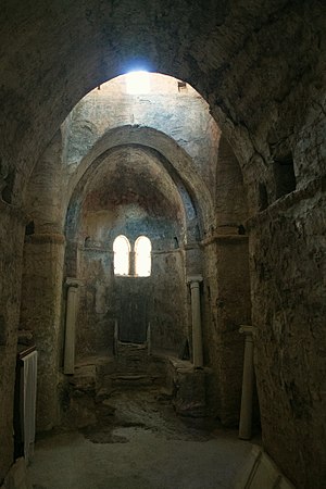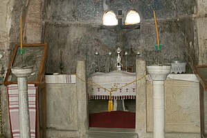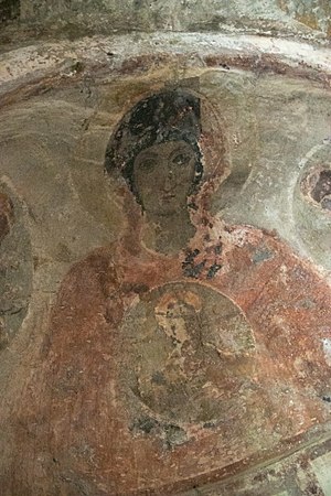 Uvnitř kostela nás překvapí mramorový ikonostas z 6. (nebo začátku 7.) století a fresky ze 7. století. Ve středověku byly přemalované novými, ale při opravách a výzkumu kostela v šedesátých a sedmdesátých letech 20. stol. byly ty pozdější přeneseny do Byzantského muzea v Athénách, zatímco ty starší zůstaly na původním místě. Boční prostory působí i při své ponurosti jako z jiného světa.