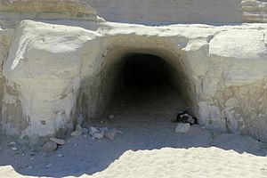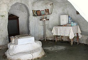 V jedné z roklí hned vedle pláže jsou hloubené jeskyně, spíš chodby, kde se prý v hojném počtu schovávali saracéni, nejspíš arabští piráti (zatímco v Kleftiku na jihu ostrova řečí zbojníci).