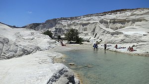 Pláž Sarakiniko je záležitost koupčaská, přírodní (mineralogická), estetická a romanticko historická. Zdejší krajinu zbytečno líčit slovy, když ji ukazují fotky v oddílu alba. Je celá v bílém, v odstínech od čerstvého sněhu přes smetanu po lehký okr nebo světlou šeď. Bývá tam dost lidí, ale naštěstí je tam ticho a občerstvovna je jenom nahoře u konce silnice. Zatím to tu udržují v přírodním prostředí.