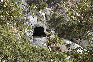 Nakonec potkáme značené rozcestí chodníčků, a to už jsme u Kyklopovy jeskyně, nad níž jsou veliké balvany. Ty se prý Kyklop chystal házet na Odyssea a jeho druhy. Během roku se jeskyně občas využívá jako útočiště pro kozy i pastýře. Krápníky tam nejsou, zajímavé je to jenom mytologicky a blízkostí té druhé jeskyně. Vchod Kyklopovy jeskyně je vysoký a široký, takže poskytuje příhodný stín a závětří k odpočinku i svačince. O poutích do sousední jeskyně toho jejich účastníci bohatě využívají. Vnitřek Kyklopovy jeskyně ten den slouží jako veřejné záchodky, což staví do divného světla člověka neznalého poměrů, když se tam pokouší fotografovat. Mimo hlavní svátek tady bývá liduprázdno, nebo potkáte několik málo turistů, někdy i poutníků.