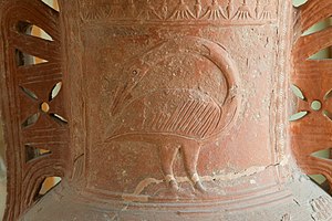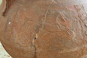 Hrdlo je zdobeno reliéfem pelikána, níže jsou reliéfy vozataje a vozu, který táhnou okřídlení koně. Nebo je to Belerofont s Pegasem? Není jasné, zda počet nohou a nozder má znázorňovat dva koně, nebo jednoho koně v pohybu.