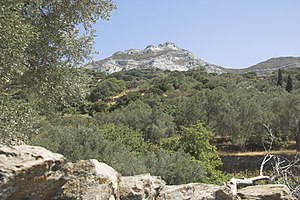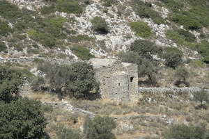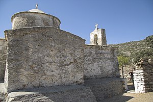 Cesta z Chalki do Moni zvolna stoupá mezi zahradami a kolem starých byzantských kostelů až pod hory, k starokřesťanskému kostelu Panagia Drosiani v Moni.